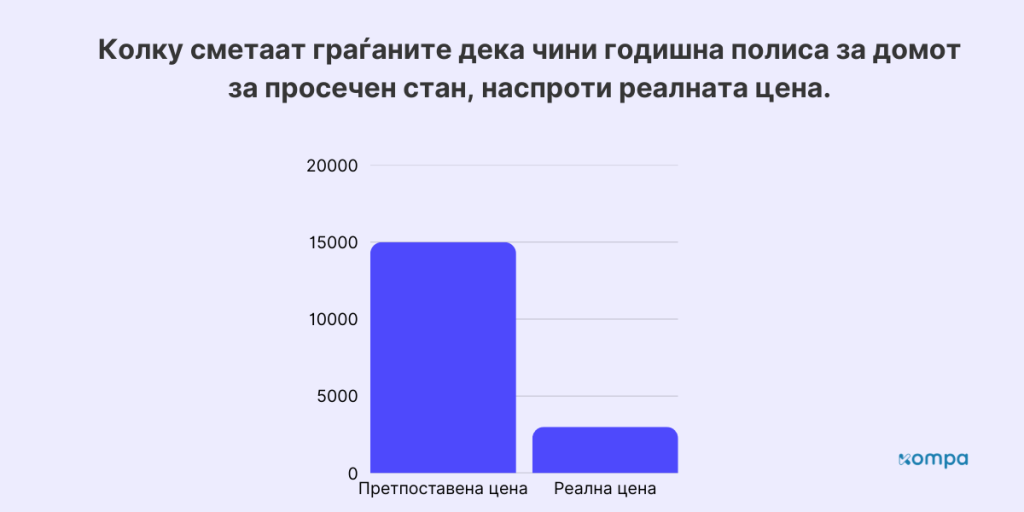 Еден од најчестите одговори што ги добивме во истражувањето е дека осигурувањето е скапо. Но, на нашето потпрашање, колку сметаат дека чини една полиса за дом со просечна квадратура, одговорите беа помеѓу 12.000 и 15.000 денари годишно. А тоа е 4 до 5 пати повисока сума одошто осигурувањето навистина чини. Ова може да го проверите на нашата страница за споредба на понудите за домаќинско осигурување со цени во реално време. За стан од 60 квадрати, најдобро рангираните понуди на Компа се движат меѓу 2600 и 3200 денари.